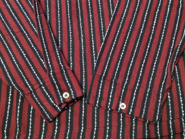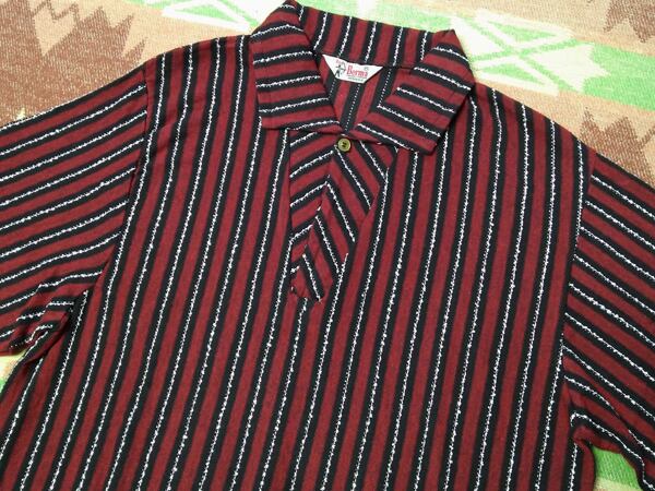 50年代の≪Bud Berma≫プルオーバーシャツ。マルーンベース黒ストライプに白いネップ状の織りライン入り。ジャガードTシャツのようなコットンニット生地、横向きのフライスといった感じで縦方向に伸縮性があります。イタリアンカラー、袖口は摘むような形のボタン留め。