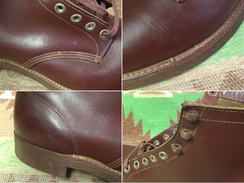 アッパーレザーは擦れやくすみ汚れ・シュータンにダメージ、左足コバに製造時のステッチずれ、左足ヒールに小さな欠け、内側汚れ、シューレース色あせなど見られますが、ワークブーツですのでいずれも気にせずガンガンお使いいただけると思います。