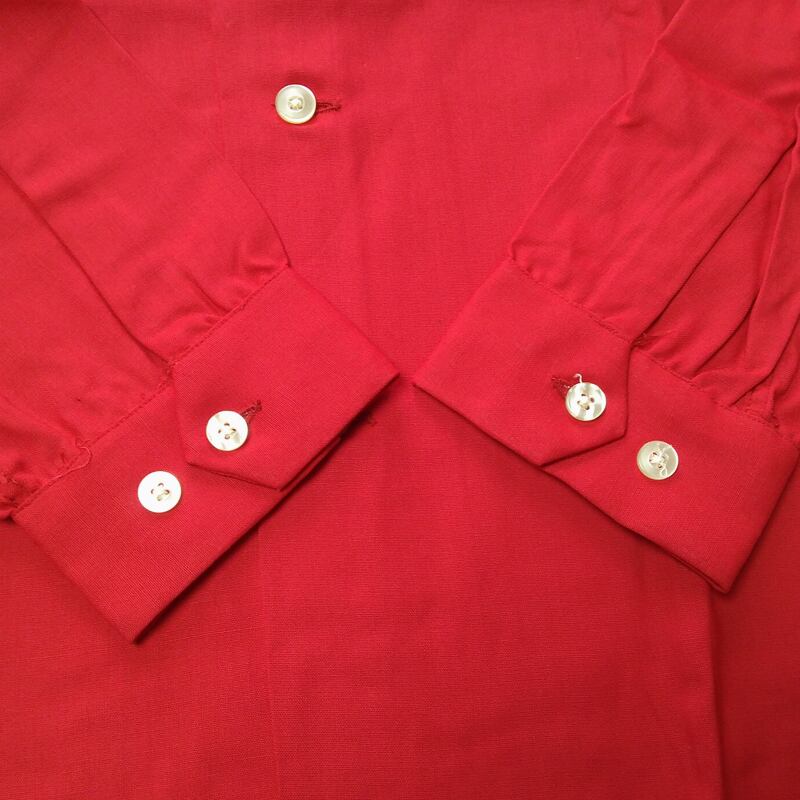 50年代のマールボロ(マルボロ)・レーヨンシャツ。袋襟、トップボタンはループ留め。赤ベースに襟裏とポケット端に黒を配した、フィフティーズらしい洒落たデザイン。襟とポケットの白いカンヌキ状のステッチも良いアクセントになっています。