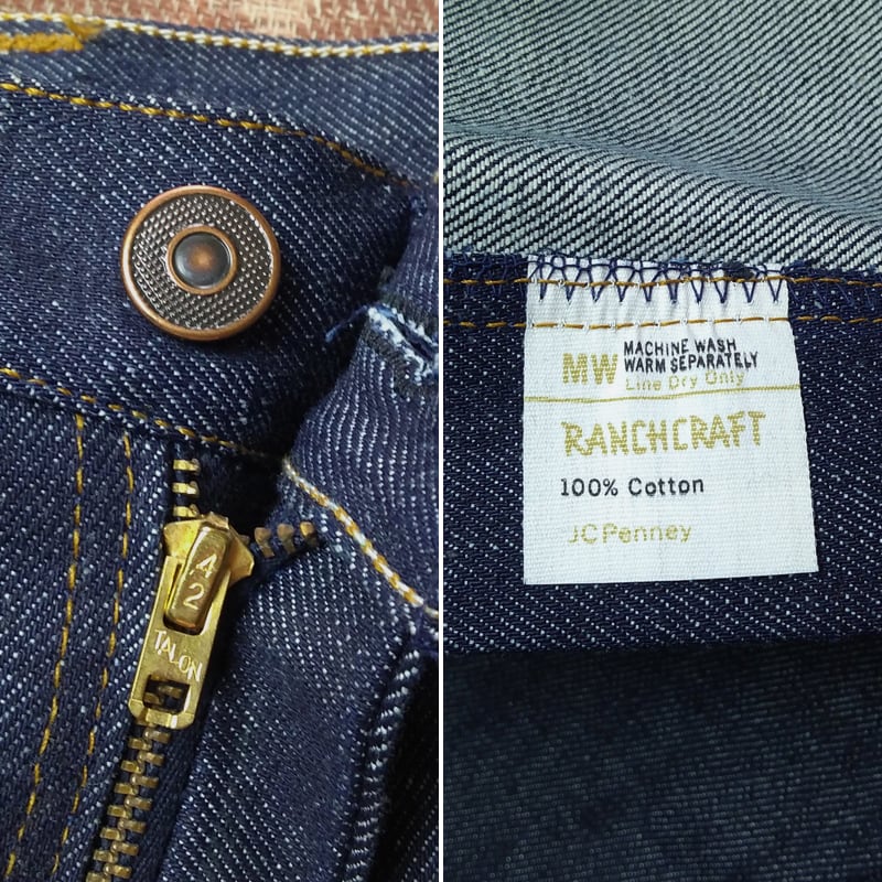 70年代のペニーズ ランチクラフト・デニムジーンズ。きれいな細身のストレート型、右綾100%コットン13 3/4オンスデニム生地。42TALONジッパー。