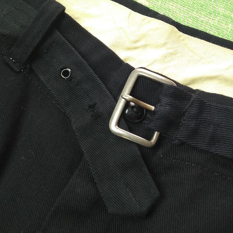 ベルトの一番大きい位置のハトメ欠損とダメージ、その隣も周囲に少しダメージがありハトメが抜けるかもしれません。バックルに若干の錆び、裾のステッチ一部抜け、内側の白い生地にシミ汚れがあります。大きなダメージや気になるシミ汚れなどは特に見られず、ヴィンテージ古着慣れされた方でしたら問題なく着られるコンディションです。