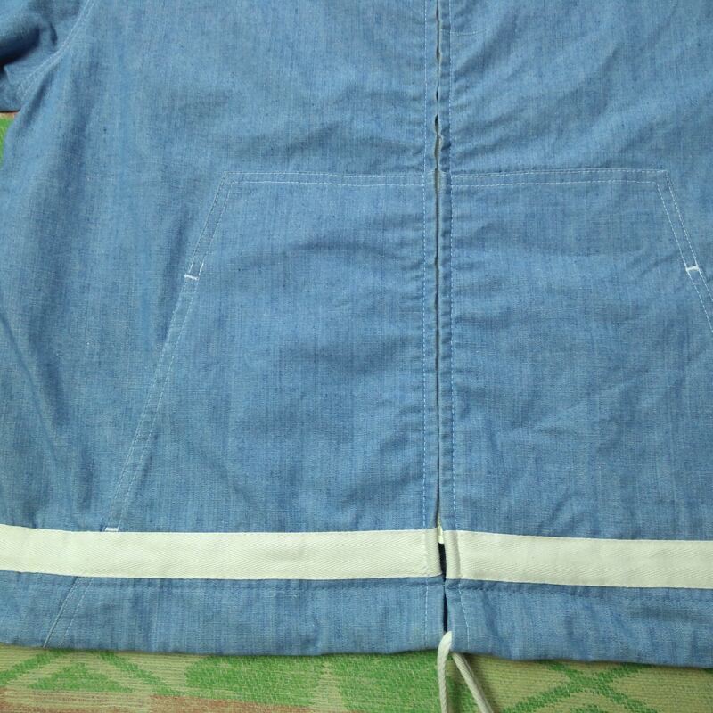 襟元の紺色のタグとポケット横のタブがカットされています。元々の生地の織りむら、襟や袖口にわずかに薄いシミ汚れがあります。ヴィンテージ古着慣れされた方でしたら、まず問題なく着られるコンディションです。