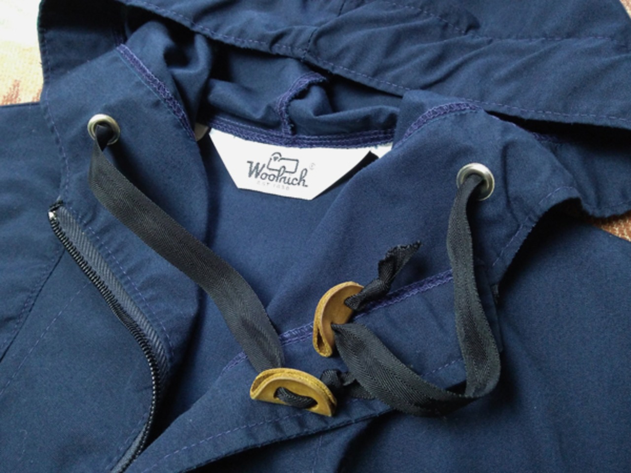 70年代~のウールリッチ・アノラック。ネイビーの65%ポリエステル×35%コットン生地。TALONジッパー。正面のポケットは胸から下全体が収納になっています。