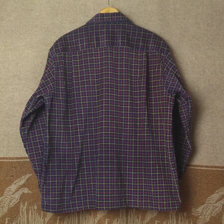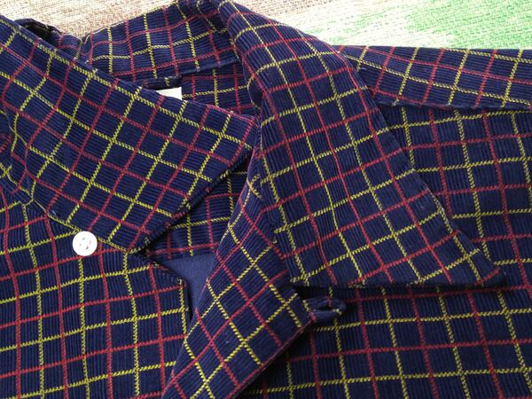 50年代のピルグリム・コーデュロイシャツ。ダークネイビーベースに赤×黄のタッターソールプリント。少しロングポイント気味の袋襟、トップボタンはループ留め。両胸フラップポケット、剣先型カフス。