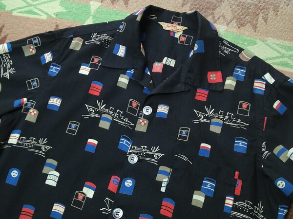 50年代のジャンセン・半袖コットンシャツ。袋襟、トップボタンはループ留め、大きめのシェルミーボタン。船舶の旗やシグナルモチーフでしょうか、色や形をさまざま組み合わせたシンボルの絵柄です。