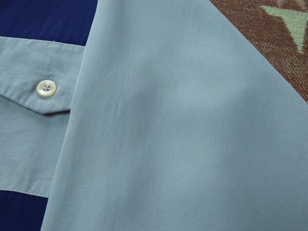 50年代のホリデー・レーヨンシャツ。袋襟、トップボタンはループ留め、ボタン留めフラップポケット。ネイビー×グレーのツートーンカラー、すとんと落ちるしっかりとしたレーヨンギャバジン生地。裾はほぼボックスに近くわずかにラウンドしたロック始末、ユニオンラベル付き。