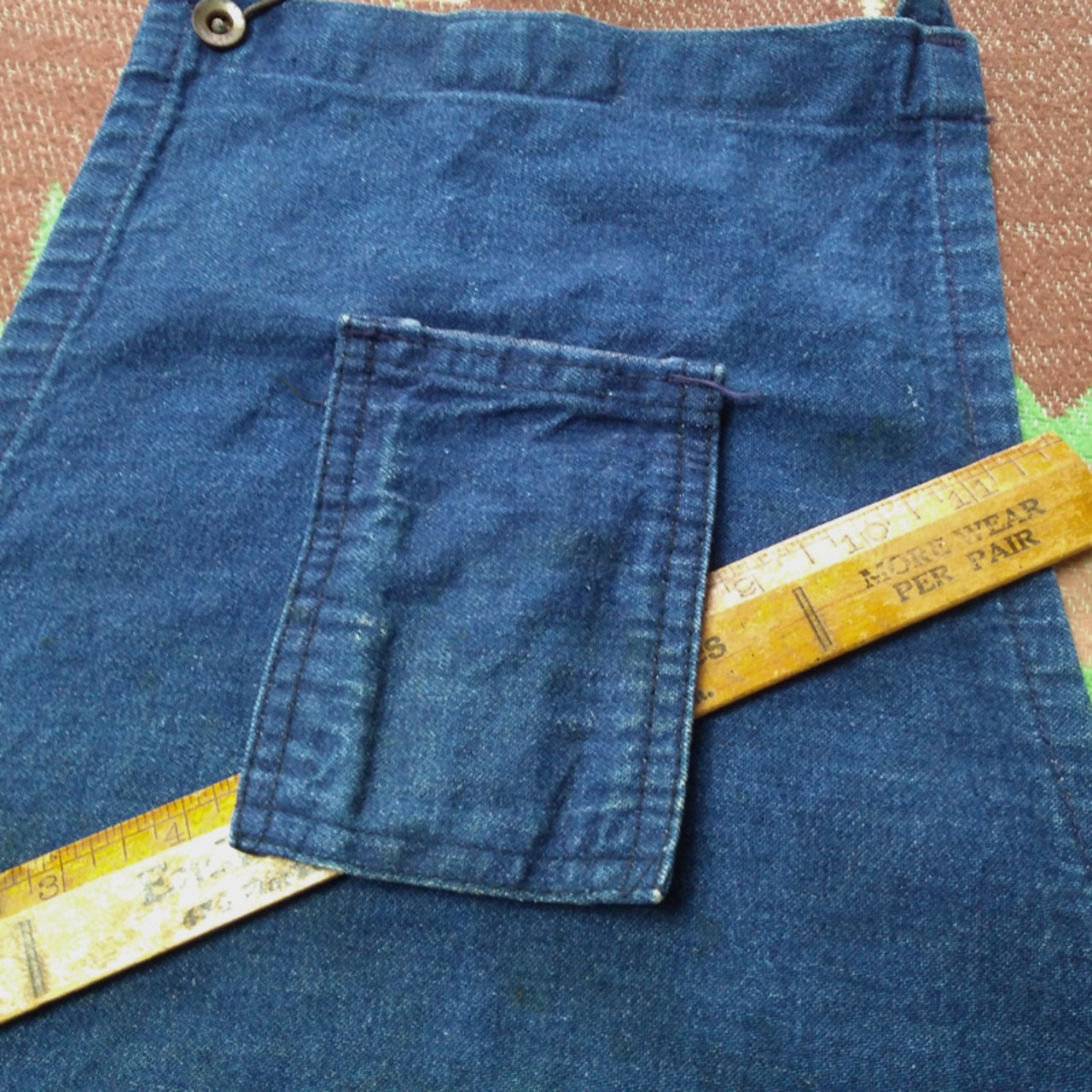 60年代~のダブルウェア・デニムワークエプロン。胸ポケットはかがんでも中身が落ちないように水平が保てるよう袋状です。デニム生地は横使いで上下生地端(上端は折り返した裏面)はセルビッジ。小ぶりな打ち込みドーナツボタン、針刺しバックル金具。