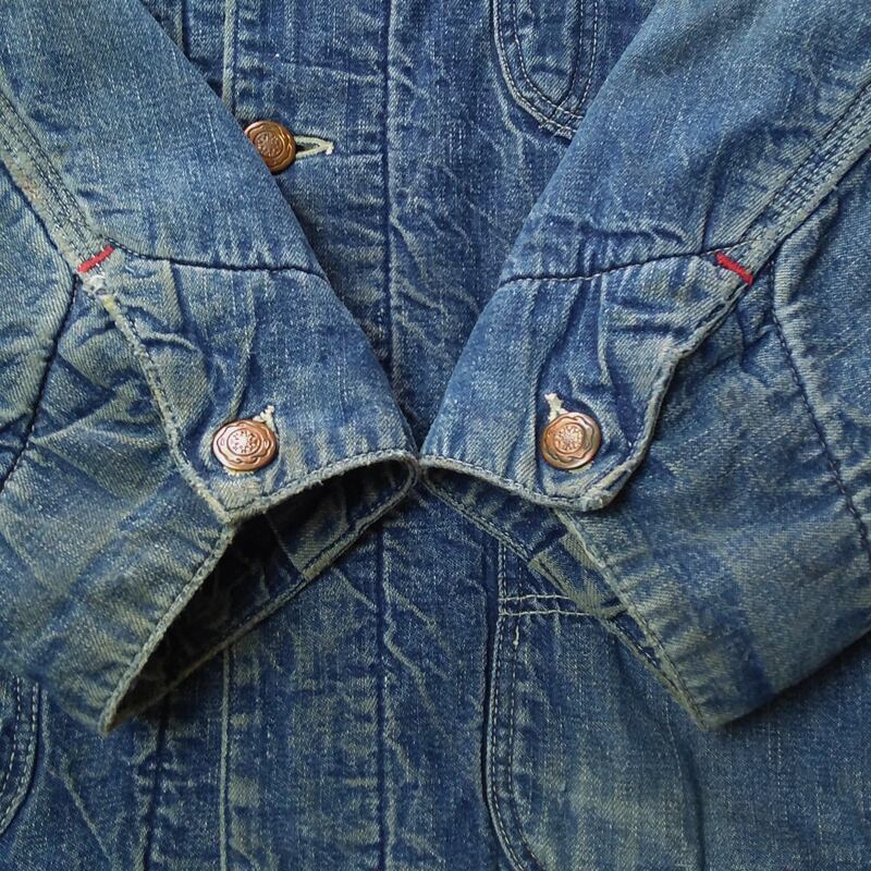 袖先のシーム部や袖口に擦れダメージ、ポケットステッチ抜け、腰に小さなキズなど見られますが、大きなダメージやリペアはありません。お腹や袖を中心にシミ汚れはありますが、アジと捉えられるものと思います。※洗濯済みです。ヴィンテージ古着慣れされた方でしたら問題なく着られるコンディションです。