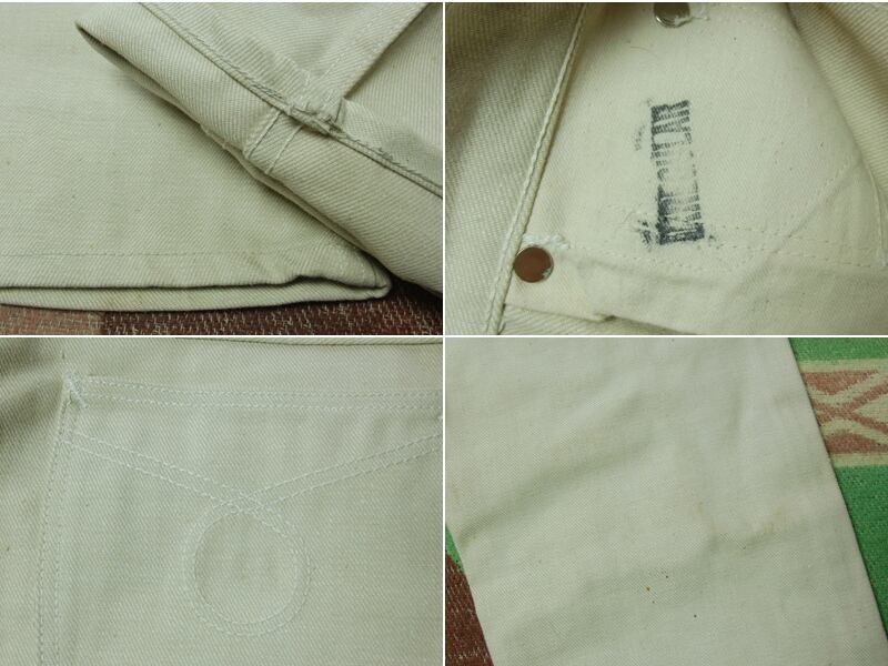 デッドストック。フラッシャーや紙タグ類は欠損、内側にイレギュラーのスタンプがあります。膝や膝裏あたりを中心にシミ汚れが見られますが、洗濯すればほぼきれいになると思いますし、気になるほどのものではないと思います。左フロントポケット下に小さな茶色シミがあります。特別大きな問題のないデッドストック・コンディションです。