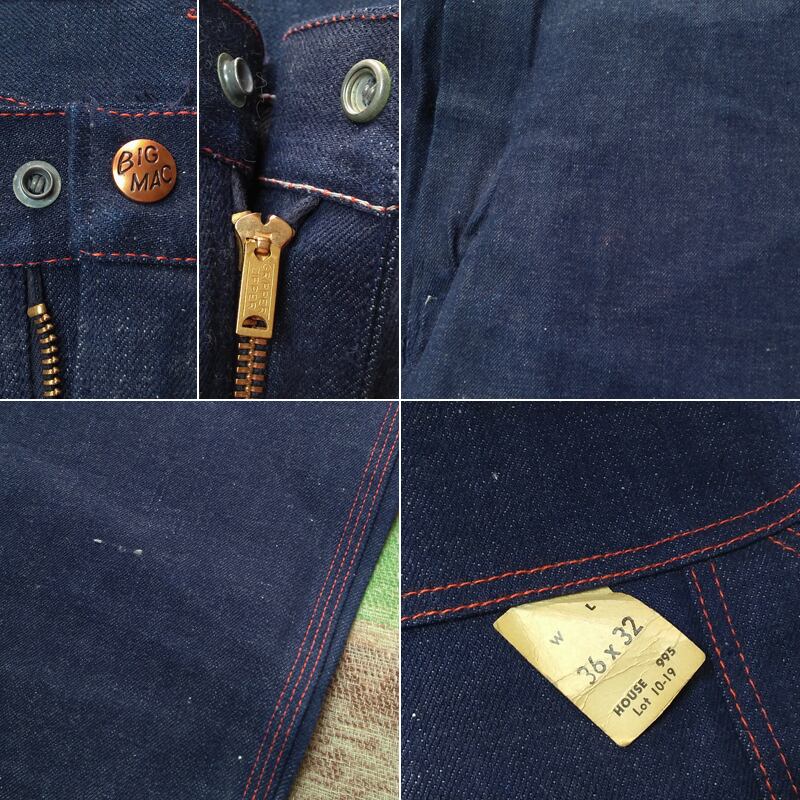 50年代の≪ビッグマック≫デニムワークパンツ。赤味が強いオレンジステッチ(ヒップ中央は紺色)、メインシームはトリプルステッチ、GRIPPERピンロックジッパー。