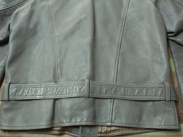 左袖ジッパーのチェーン欠損・フロント差し込み口に擦れがありますが、ジッパーはすべて問題なく開閉可能です。ベルトの一番小さい穴から7cmあたりに穴が開けられています。肩・袖・ベルト等を中心にレザー表面の擦れ、胸元・袖・背中など若干のシミ汚れは見られますが、気になるようなものは特にないと思います。ライニングも色あせ・シミ汚れはありますが問題ありません。ヴィンテージレザージャケットにご理解のある方でしたら、まず問題のない良好なコンディションです。