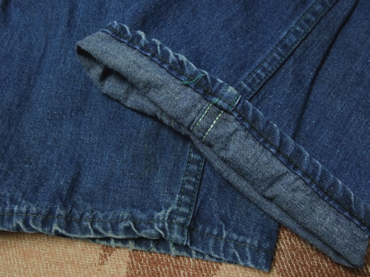 縦落ちが見られる部分がありますしパッカリング・アタリもくっきり出ていて、OLD感ある雰囲気です。なんといってもステッチの色が良いですし、いわゆるペインターパンツ型としては股上が浅く(約31.5cm)すっきり穿けるのも特徴です。