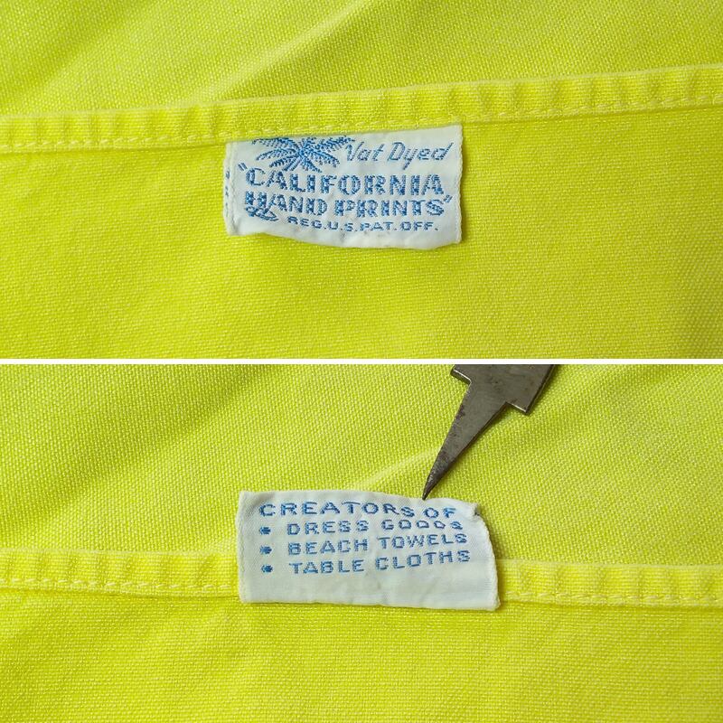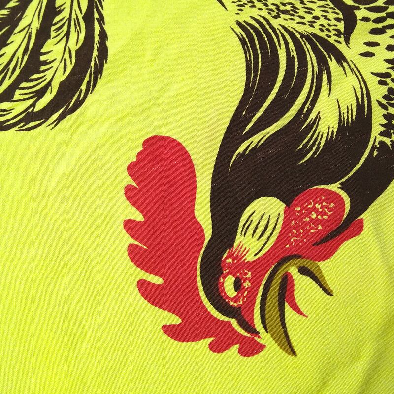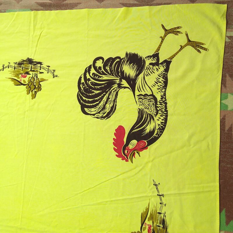 50年代の≪カリフォルニア ハンドプリント≫テーブルクロス。鶏のハンドプリント、カタリナやマクレガー等のハワイアンシャツなど同年代の衣料品でも見られるものと同様のテイストです。レモンイエローのコットン生地、ワークシャツと同じくらいの厚みのしっかりした生地です。※ややビビッドに写った画像があるかもしれませんが、やわらかいトーンの色味です。
