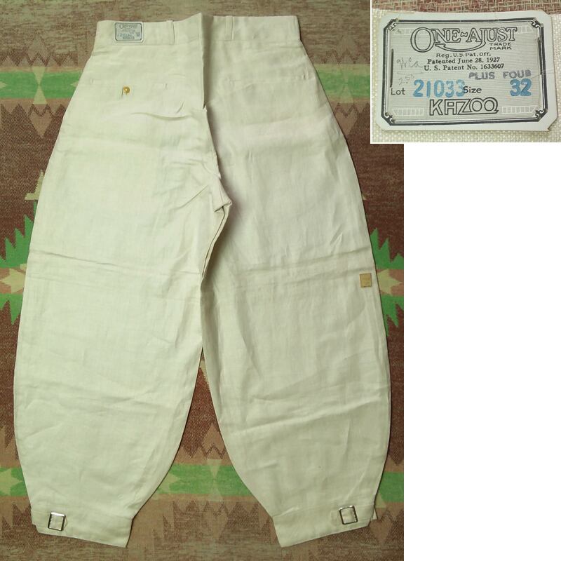 1920年代~の≪KAZOO≫ニッカーズ。オフホワイトに近いナチュラルカラーのリネン生地。ウエストダブルボタン、ユニオンラベル付き。紙ラベルに1927年パテント表記があります。≪ONE-AJUST≫と名付けられた裾のアジャスターに関する特許です。