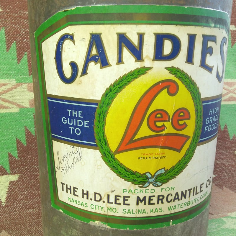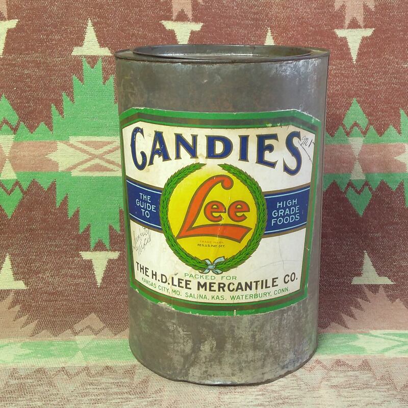 1920年代前後の≪Lee≫キャンディー缶。スチール製。