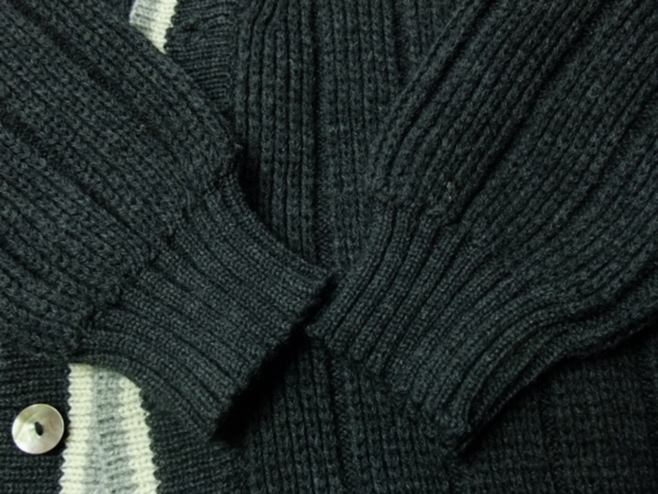 50年代~のゴールデン ブレント・カーディガン。ざっくり大きく開いたショールカラー。チャコールベースにグレー×白トリム、100%ウール素材。同年代の似たようなスタイルに比べ、ずっしりと重量感・厚みがあるニットです。