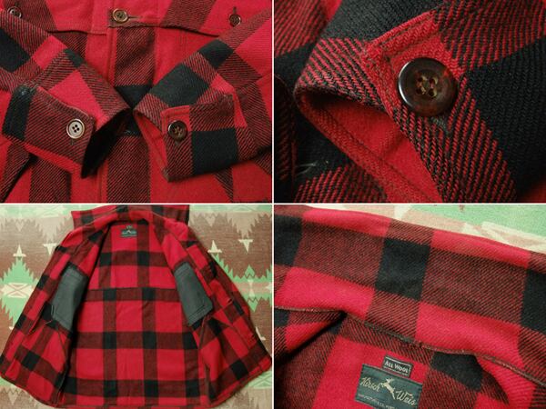 40年代の≪ハーシュワイス≫ウールジャケット。レッド×ブラックのチェック。バストアップの生地が二重になっています(袖は一重)。フロント4ポケット、腰にゲームポケット。OLD感ある茶系のベークライト調ボタン。台襟がないイタリアンカラーのように開いた襟が特徴的です。襟を立ててボタンで留めることができます。