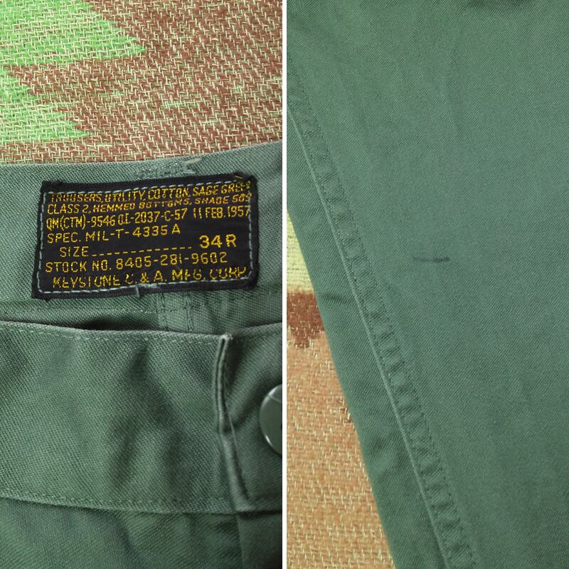 50年代の≪USエアフォース≫ユーティリティトラウザーズ(SPEC.MIL-T-4335A)。1957年≪KEYSTONE C. & A. MFG, CORP.≫製。セージグリーンのコットンサテン生地。正面はベイカーパンツ同様の貼り付けポケット+サイドポケット、バックは左のみフラップが付きます。ウエストは腰のスナップボタンアジャスターで調整可能。