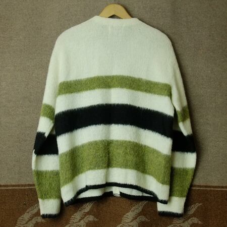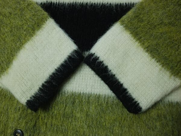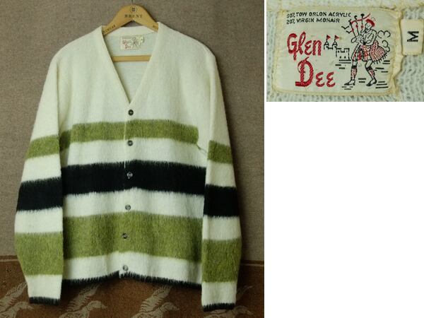 60年代~のグレン ディー・モヘアカーディガン。80%アクリル×20%モヘア素材。オフホワイトにモスグリーン×黒のボーダーパターンが良いヴィンテージ・モヘアカーディガンです。