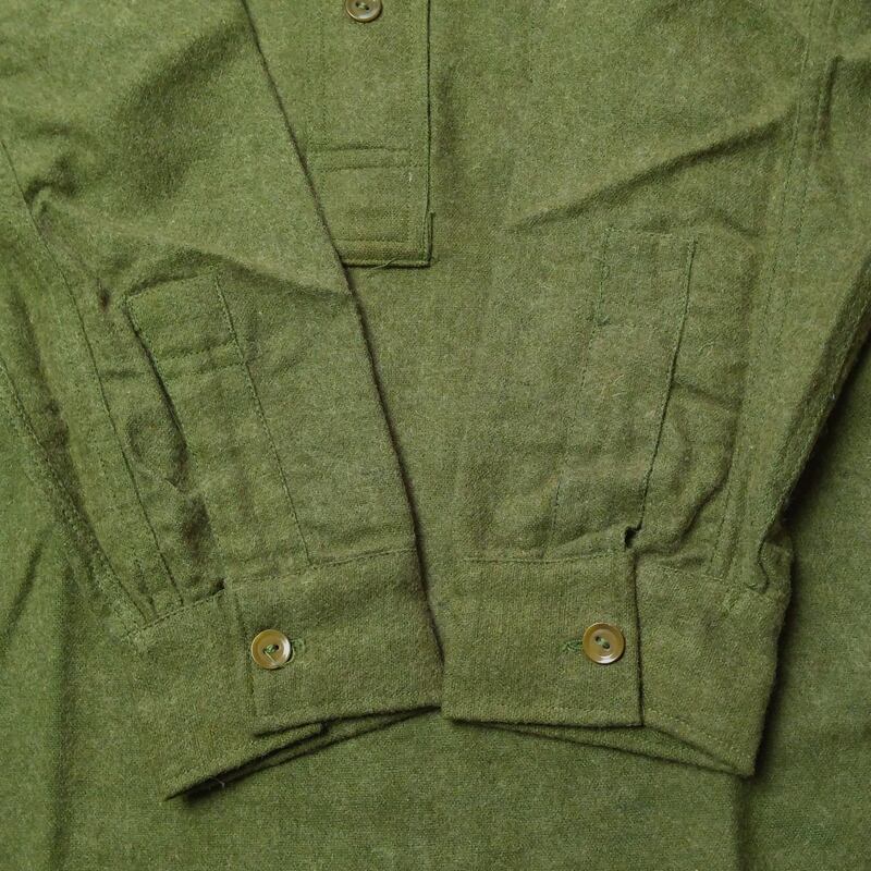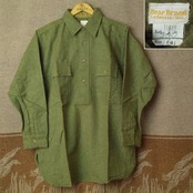 30年代前後のベアーブランド・プルオーバー ウールワークシャツ。オリーブ系のウール生地、ミリタリー民間あるいはCCC物かもしれません。裾サイドはマチ付き。