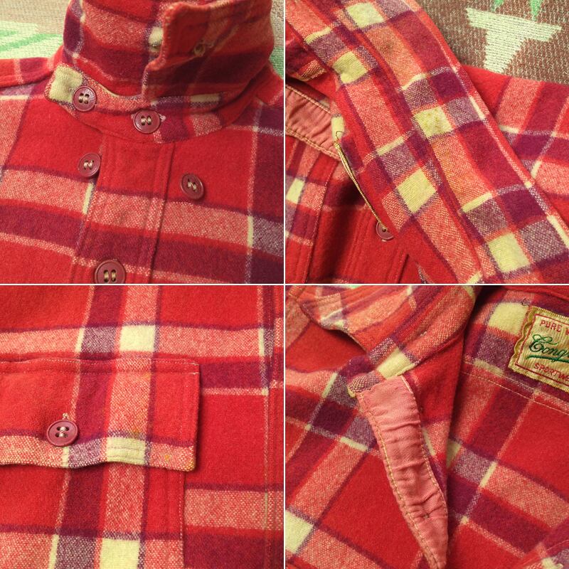 赤系チェックのピュアウール生地、赤塗りボタン、裾サイドはマチ付き。