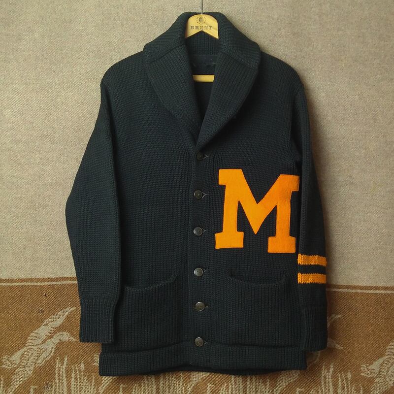 30年代前後の≪ロウ&キャンベル≫ショールカラー カーディガン。黒×オレンジのローゲージニット、フェルトレター付き。