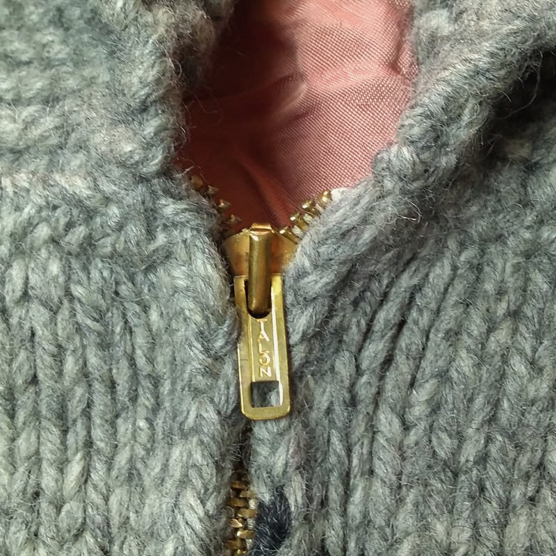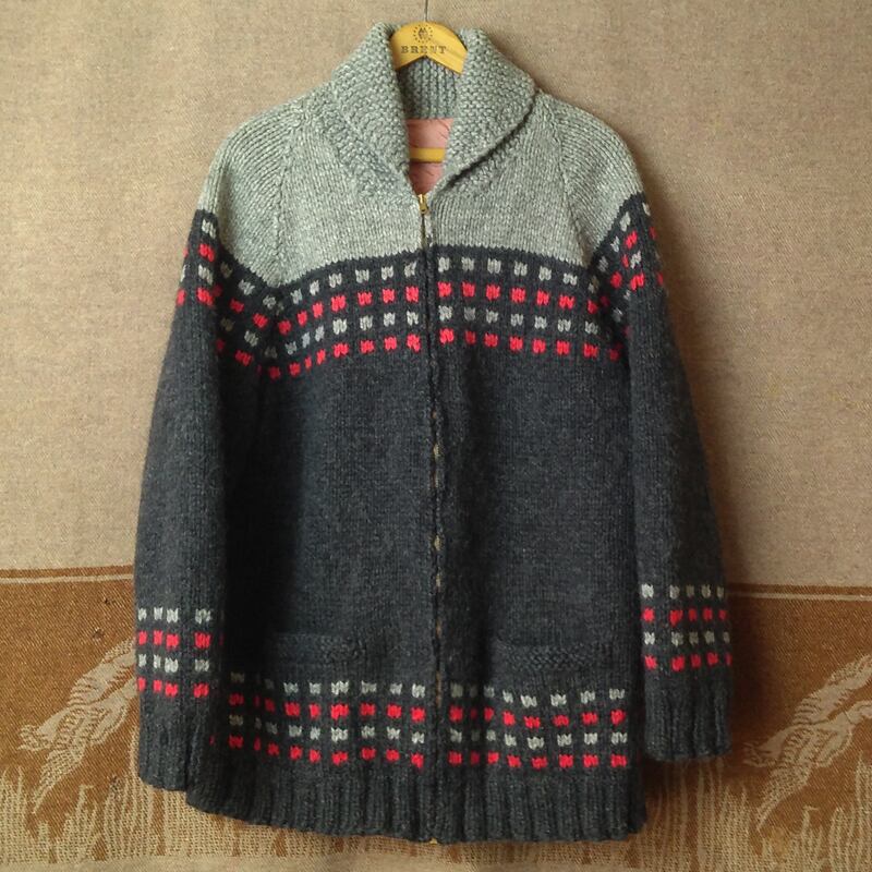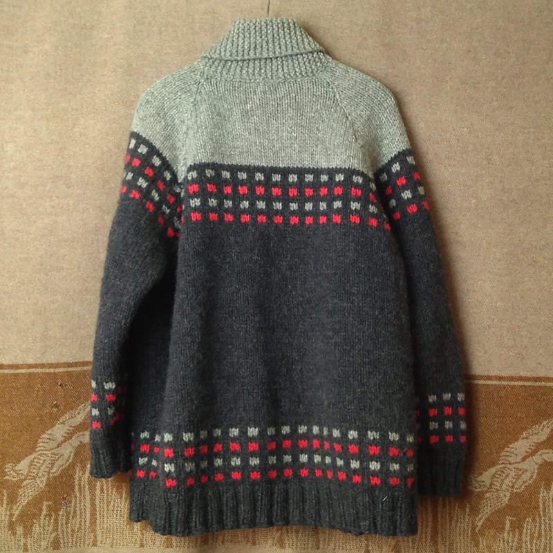 60年代のカウチンセーター。ポケット付き。チャコール×グレー×赤の良い柄パターン。棒TALONジッパー。