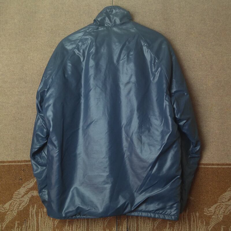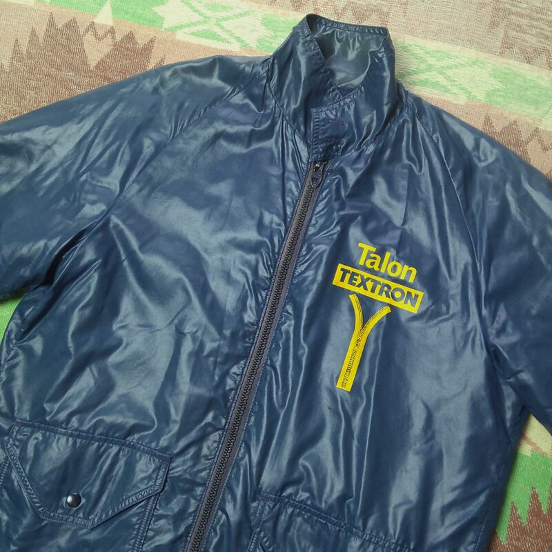 70年代の≪チャンピオン≫ランナーズタグ・コーチジャケット。≪Talon TEXTRON≫ジッパーのプリント入り。くすんだネイビーのナイロン生地。身頃はフリース、袖は薄い中綿キルティングのライニング。クタっと柔らかく着やすそうです。