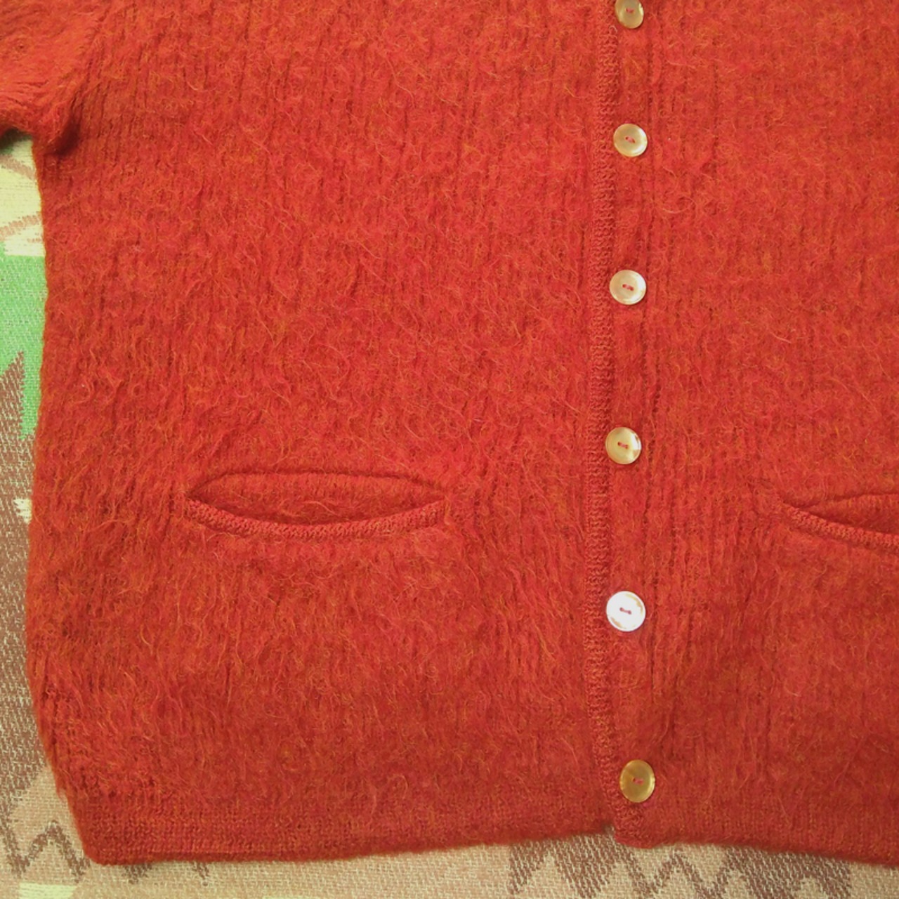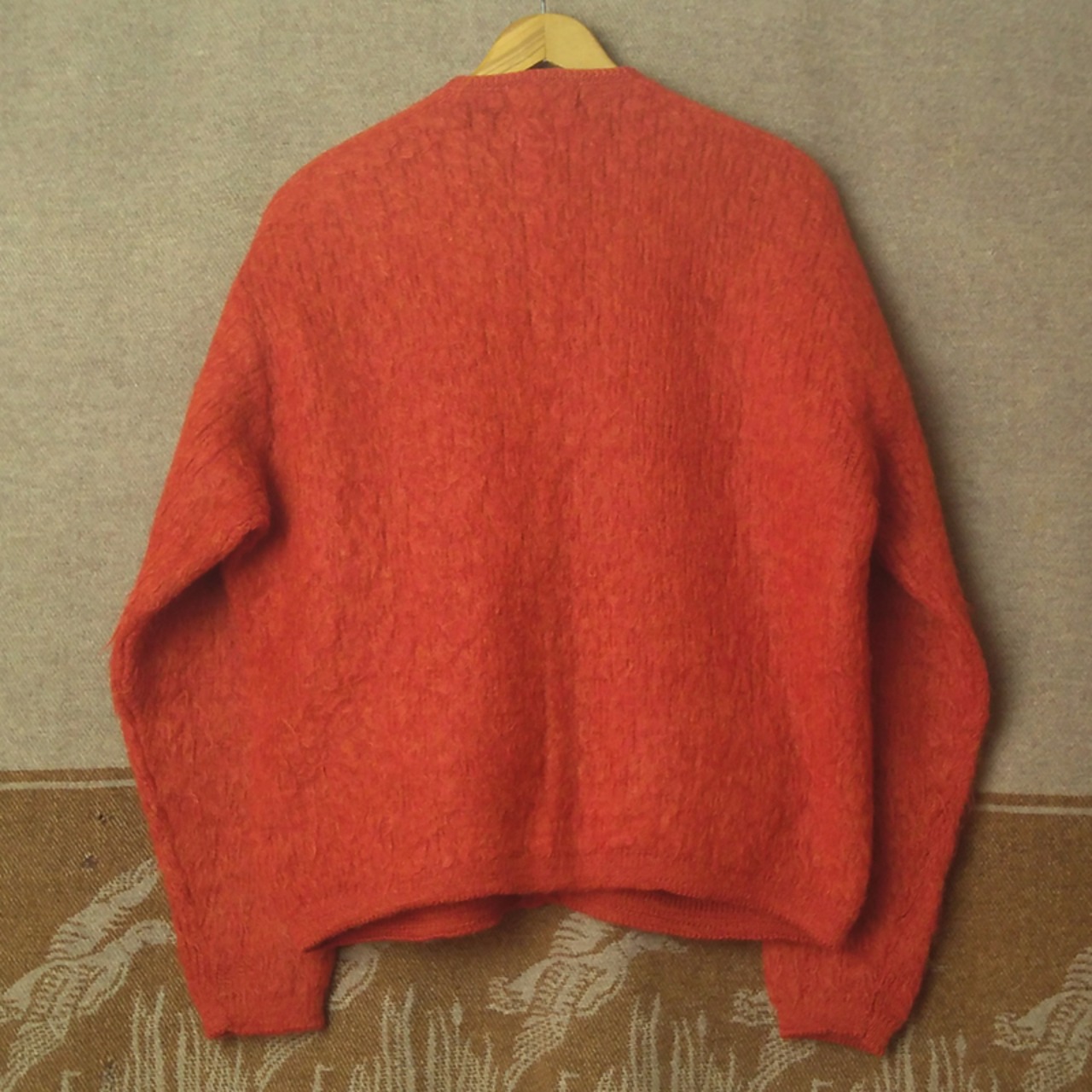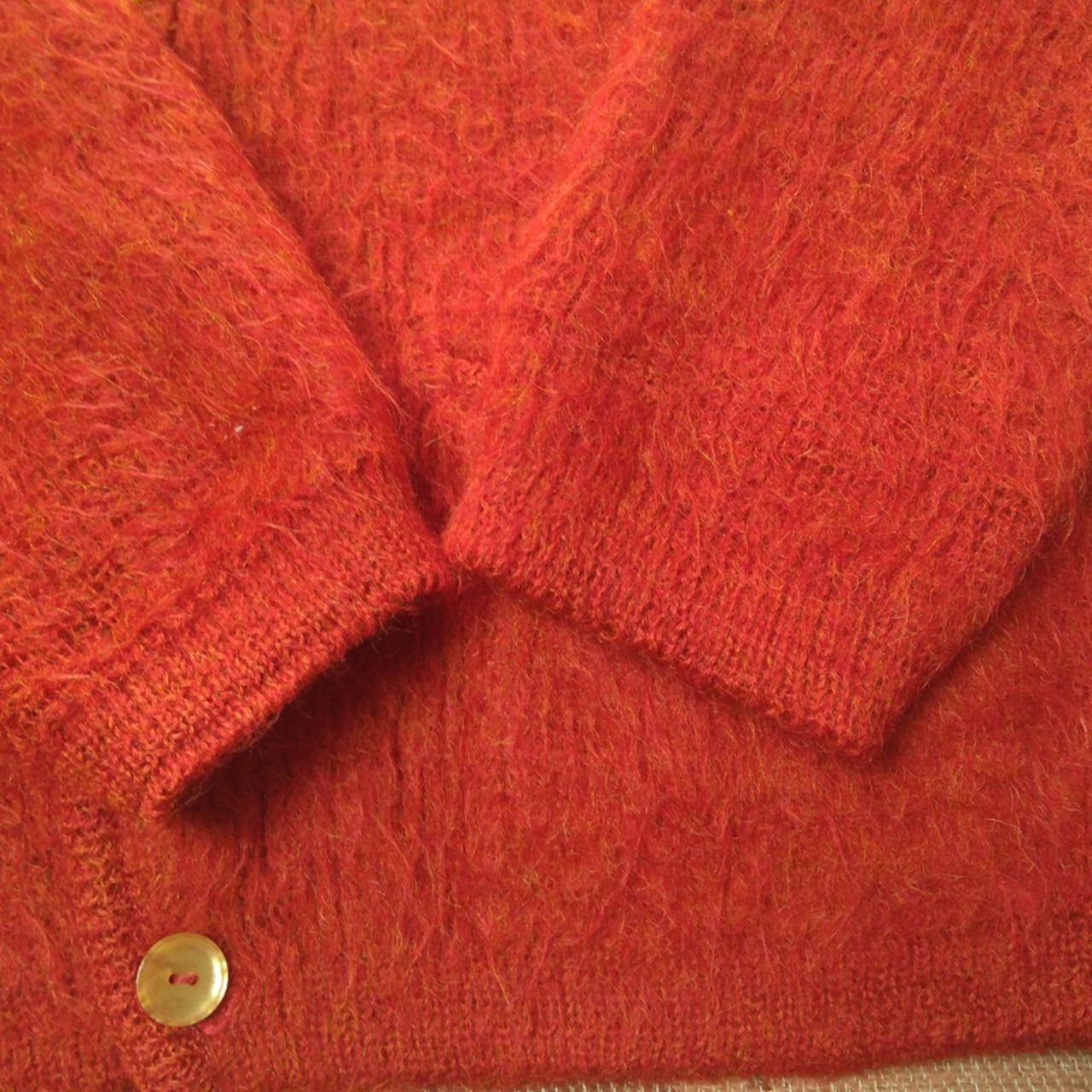 60年代の≪リビア≫モヘアカーディガン。柿色×黄色ミックスの暖かみのあるカラー、65%モヘア×35%ウール。