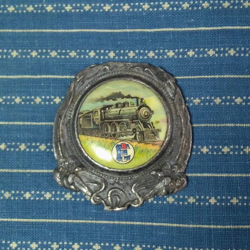 1910年代前後の≪フィンクス≫ポケットウォッチフォブ。こういったフォブとしては厚みがありずっしりと重量感があります。正面には機関車柄(B of L E =Brotherhood of Locomotive Engineers)のセルロイドがはめ込まれたデザインです。