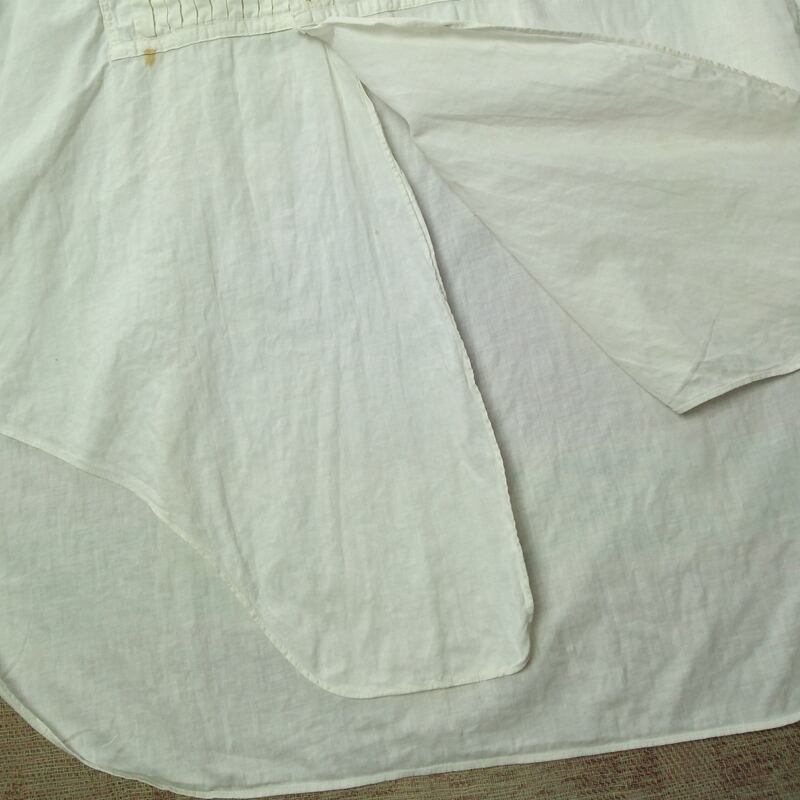 1910年代前後の≪卍 SWAS≫ドレスシャツ。プリーツビブフロント(プリーテッドブザム)、バンドカラー(デタッチャブルカラー)、シングルカフス(要カフスボタン)、裾サイドはマチ付き。白コットンもしくはリネン、襟・ビブ・カフスはバリっと硬い質感です。