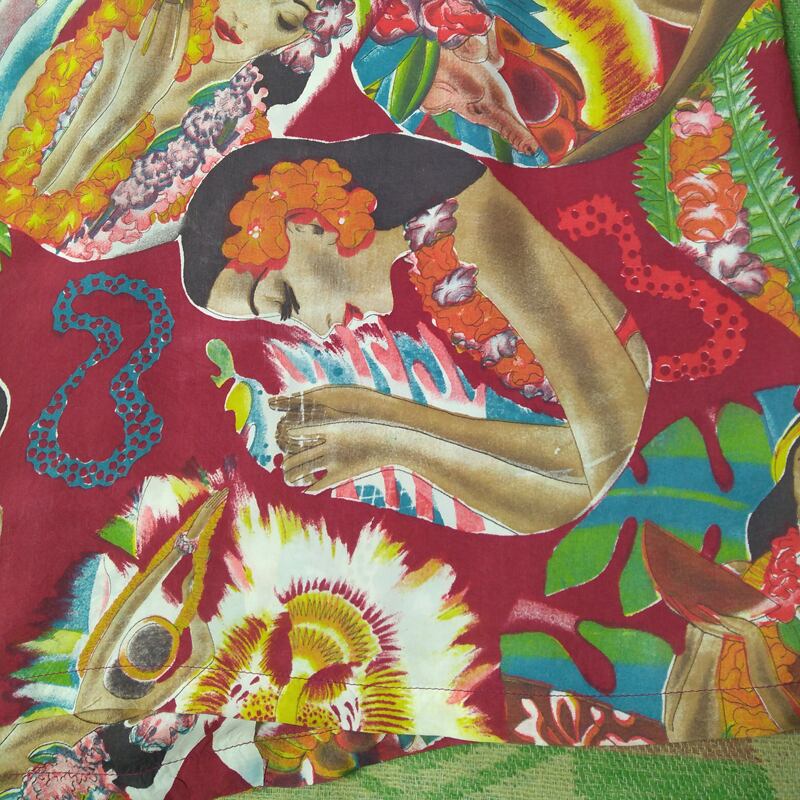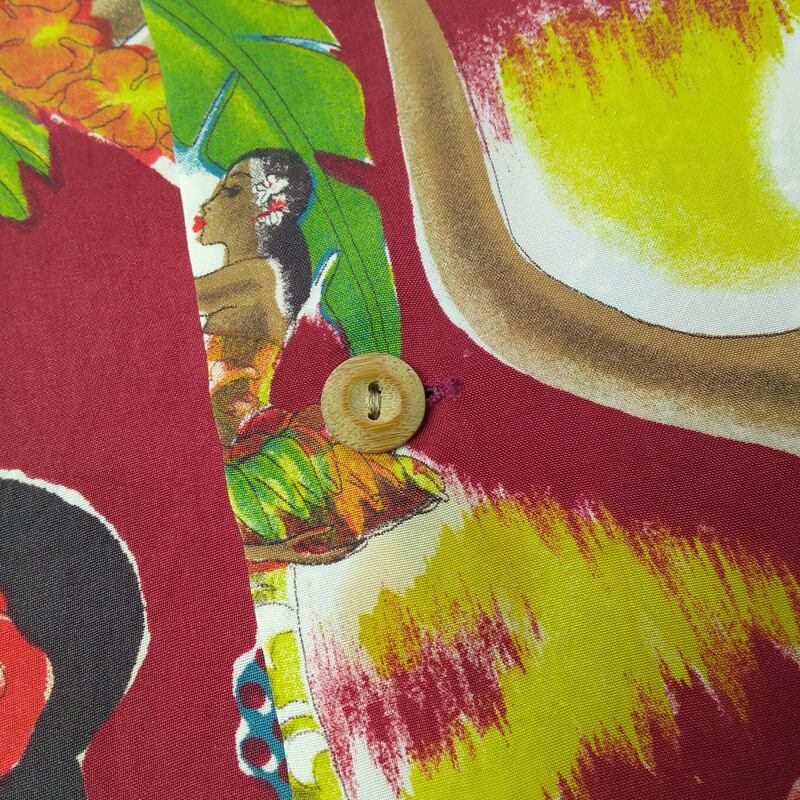 40年代の≪KUU-IPO≫レーヨンハワイアンシャツ。袋襟、トップボタンはループ留め、バンブーボタン。マトソンラインメニュー柄(フランク マッキントッシュデザイン)。