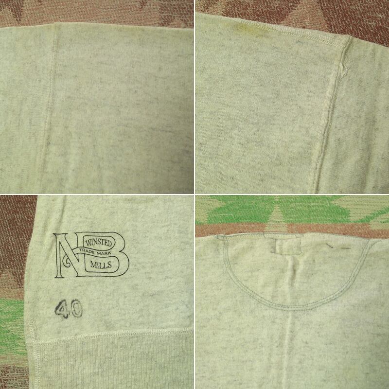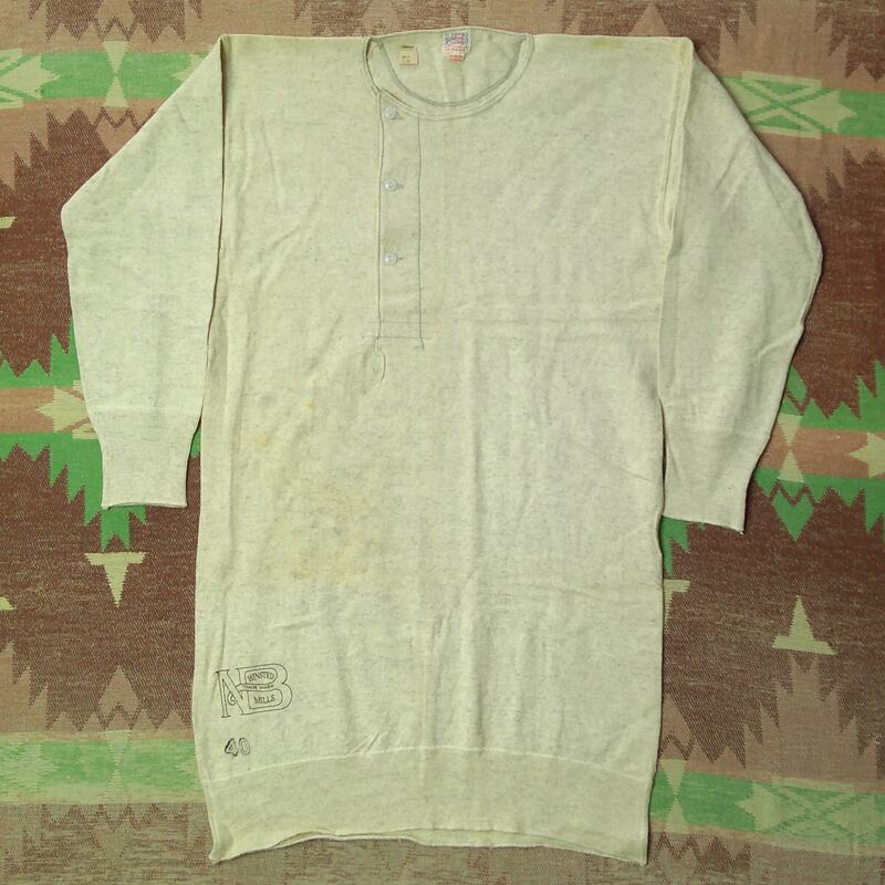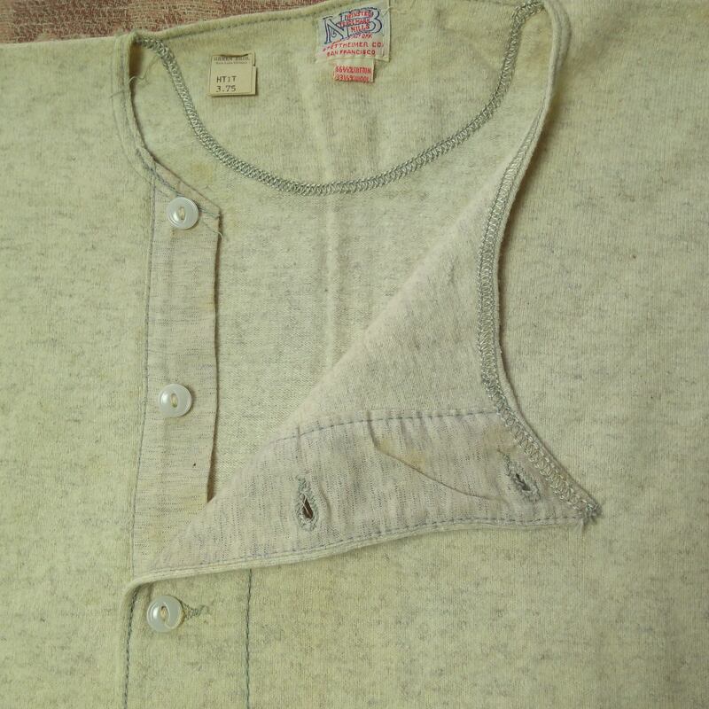 40年代前後の≪STETTHEIMER CO.≫ヘンリーネック アンダーシャツ。66 2/3% コットン×33 1/3% ウール。猫目ボタン。