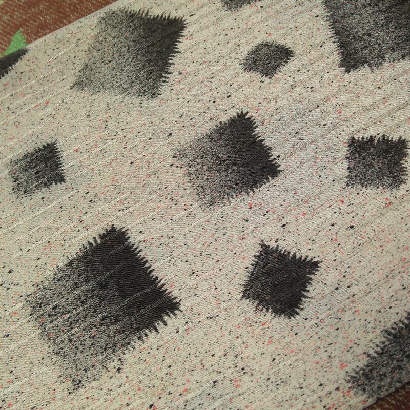 40年代前後のレーヨン ストール。アイボリーベースにピンク・黒のスプラッターのようなプリント。ランダムに途切れているライン状の織り柄入り。