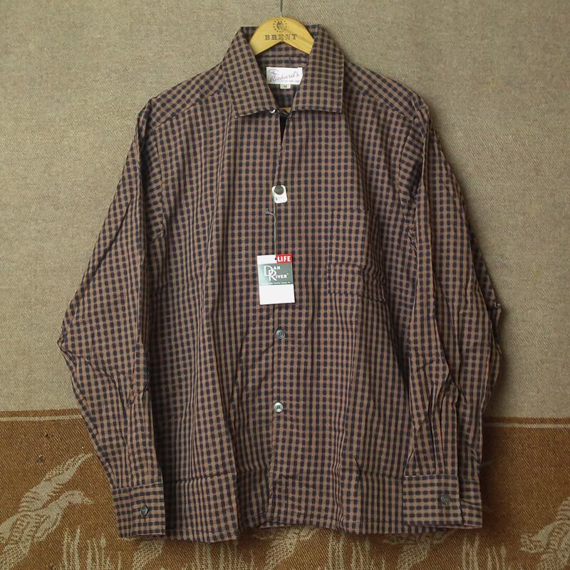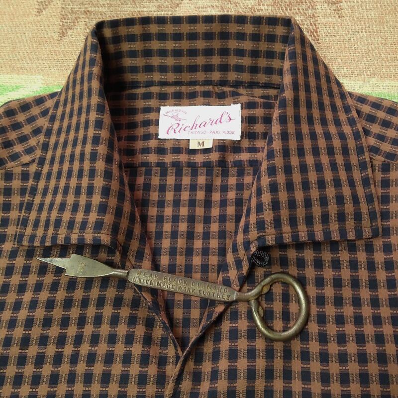 60年代の≪Richard‘s≫コットンシャツ。イタリアンカラー(脱着式のステイ)、トップボタンはループ留め。茶×黒、織り柄入りのダンリバーファブリック、100%コットン。