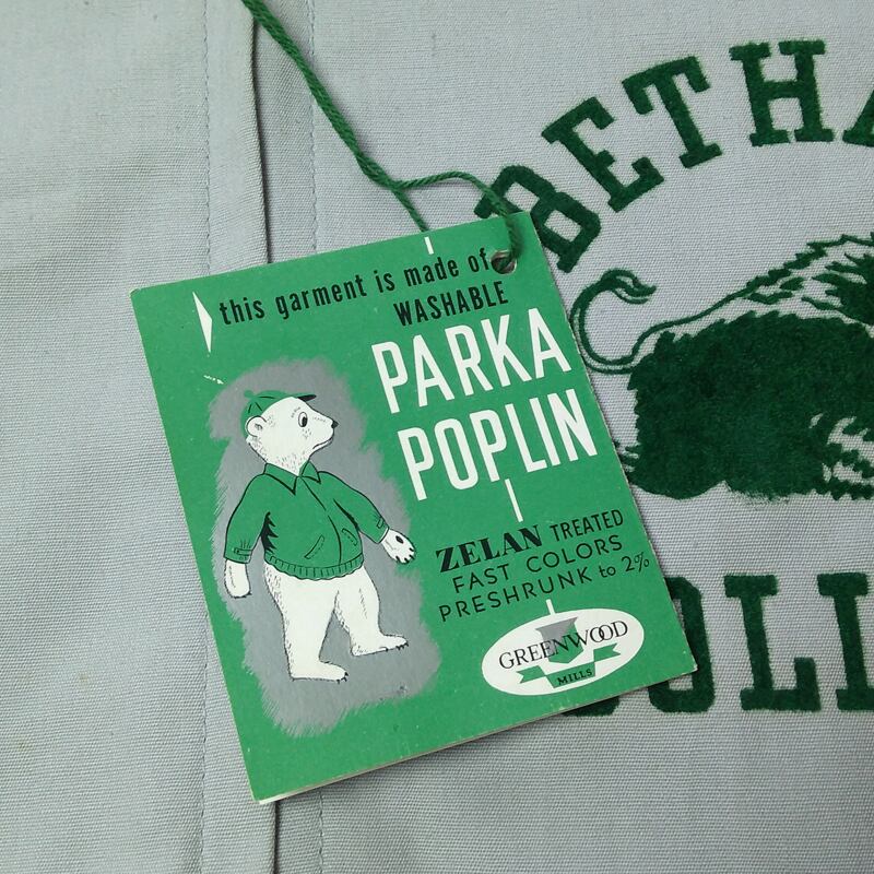 50年代の≪チャンピオン≫ジャケット。ライトグレーのコットンポプリン生地、フラッシャー付き。カレッジフロッキープリント。CONMARジッパー。