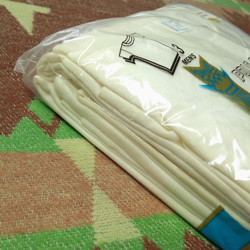 ※未開封のためシミ汚れなど確認することができません。見える範囲で若干の黄ばみ汚れがあります。白は洗濯・漂白によりきれいになりますので問題ないとは思いますが、数十年を経過したアメリカ製・デッドストックをご理解いただける方のみご検討ください。