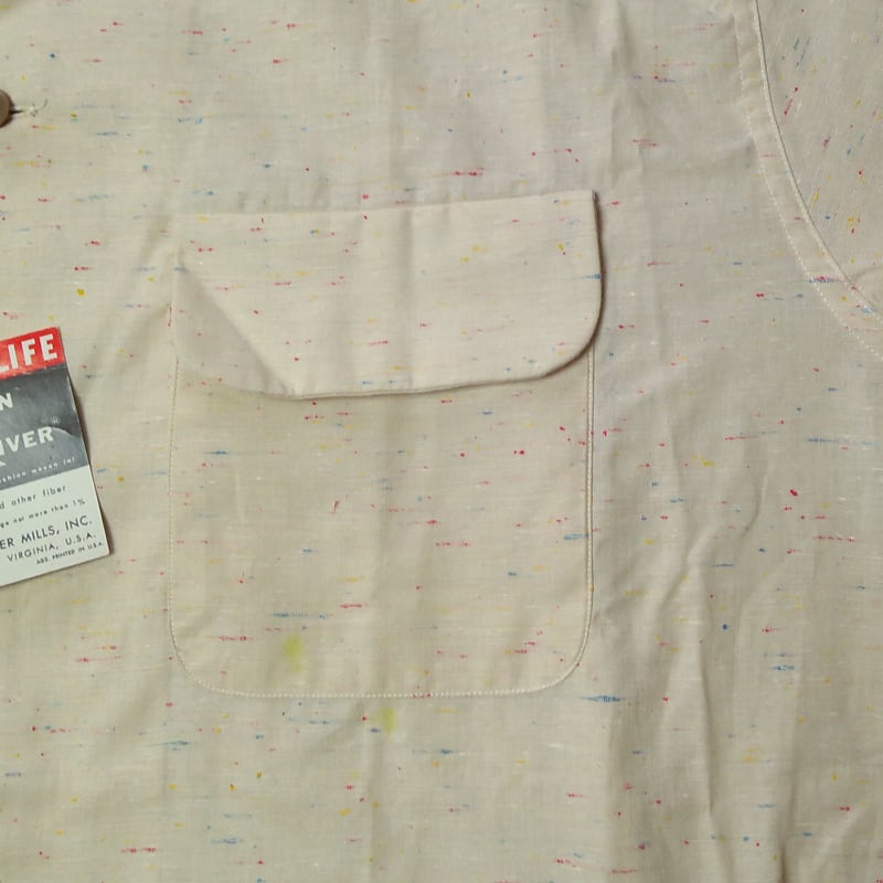 50年代の≪ネルソン ペイジ≫コットンシャツ。丸襟の袋襟、トップボタンはループ留め、両胸フラップポケット、足付きボタン。かすり状の織りにカラフルなネップを散りばめたコットン(混紡)生地、ダンリバーファブリック。