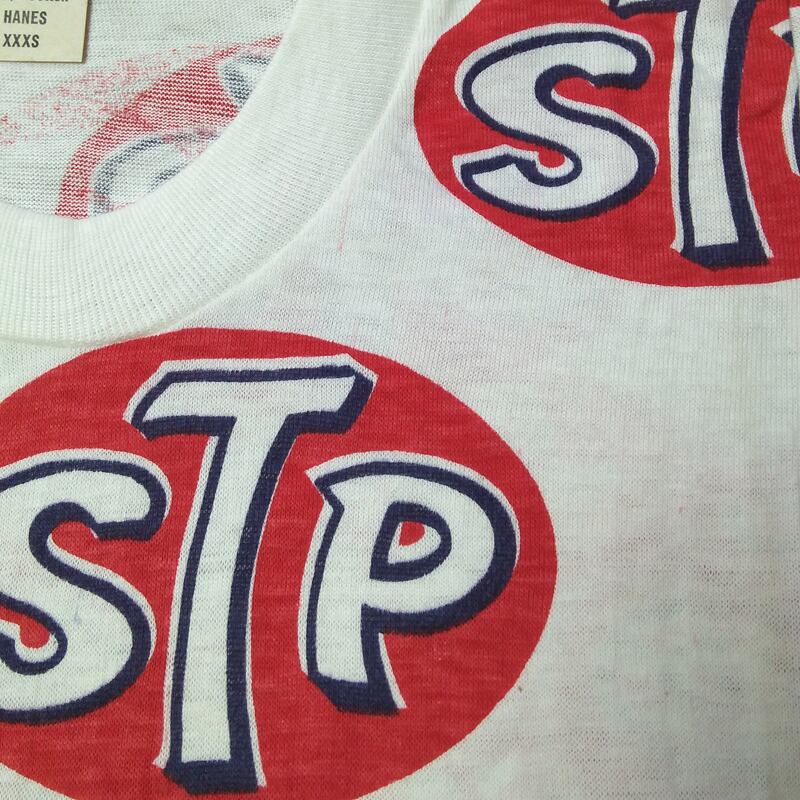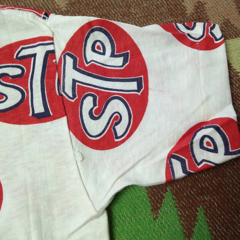 60年代のSTP総柄染み込みプリントTシャツ。ヘインズの100%コットンボディ。プリントミスがありイレギュラー扱いになったものと思われ、紙タグに変更されています。