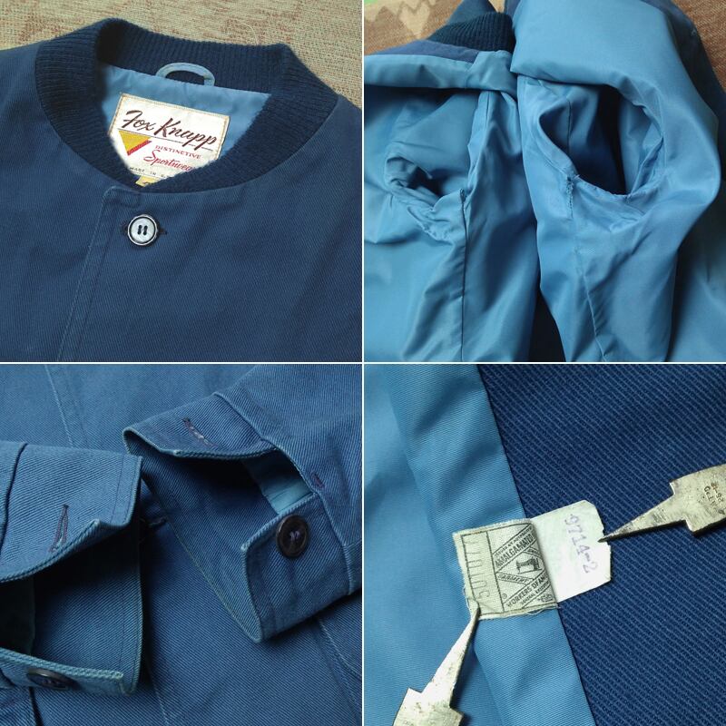 60年代の≪フォックス ナップ≫ジャケット。くすんだネイビーブルー、裏面ボンディングと思われるやや硬質な風合いのコットンツイル生地。ナイロンライニング、ユニオンラベル付き。MADE IN USA
