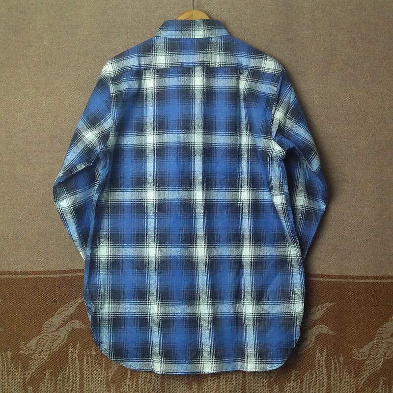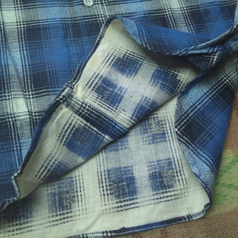 60年代の≪パワーハウス(MONTGOMERY WARD)≫フランネルシャツ。青・黒・白のチェックの100%コットン プリントライトフランネル。ロングテールのワークシャツタイプです。シンガポール製。