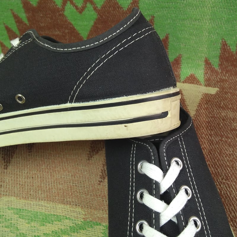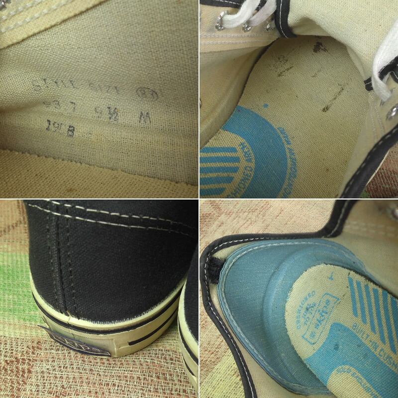 若干のシミ汚れやラバー黄ばみなどは見られますが、コンディションに関して気になる点は特にありません。硬化や劣化も見られず十分な柔軟性があります。ヒールパッチは右が欠損、左も剥げそうな状態です(発送の際などに外れてしまう可能性もあります)。シューレースは擦れや黒ずみがあります(オリジナルかはわかりません)。