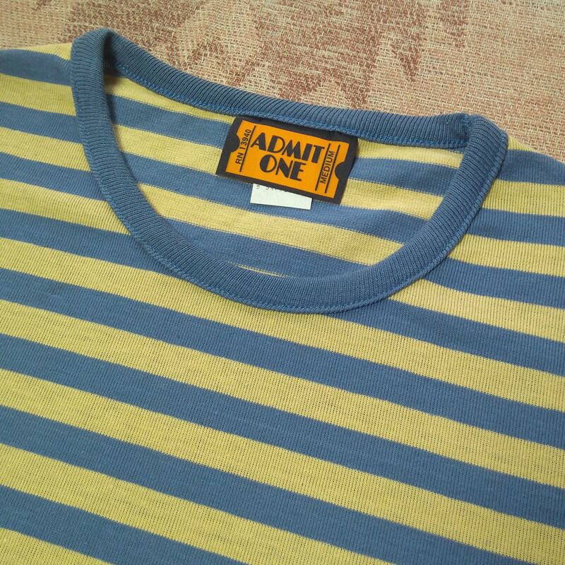 70年代の≪ADMIT ONE≫ボーダーTシャツ。くすんだブルー×ベージュ、50%ポリエステル×50%コットン。MADE IN USA
