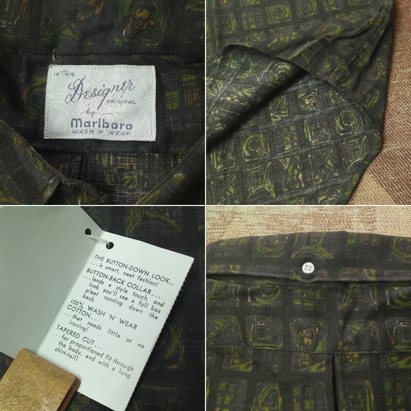 60年代の≪マルボロ(マールボロ)≫ボタンダウン コットンシャツ。バックヨークにボックスプリーツ。墨黒のようなカラーに油絵調?の絵柄、やや目が粗い生地感です。