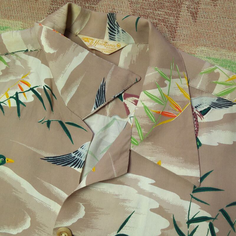 50年代の≪Hookano≫レーヨンハワイアンシャツ。襟元にボタンのない開襟(袋襟)、バンブーボタン。カモ柄の縮緬レーヨン生地、ポケット柄合わせ。
