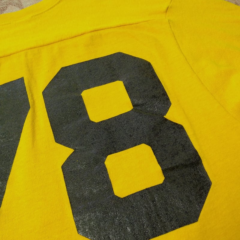 70年代の≪チャンピオン≫バータグ・フットボールTシャツ。黄色(山吹色)、ヘビーオンス厚手の100%コットンボディ。MADE IN USA