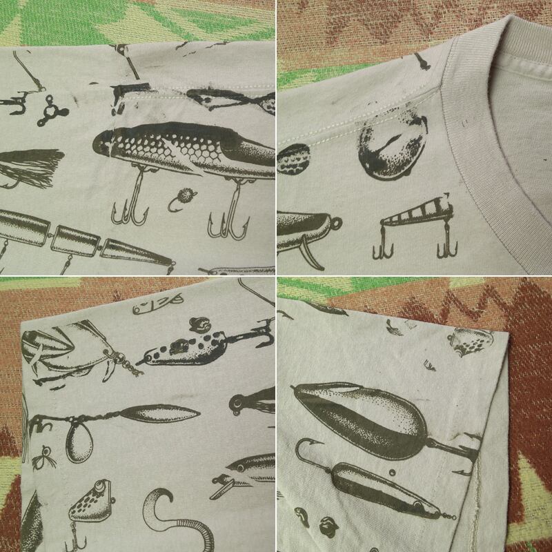 90年代の≪GO FISH CO.LTD.≫総柄プリントTシャツ。ルアー・スピナーベイト・ワームなどなど、さまざまな釣り具の柄。≪TENNESSEE RIVER≫の100%コットン、MADE IN USA