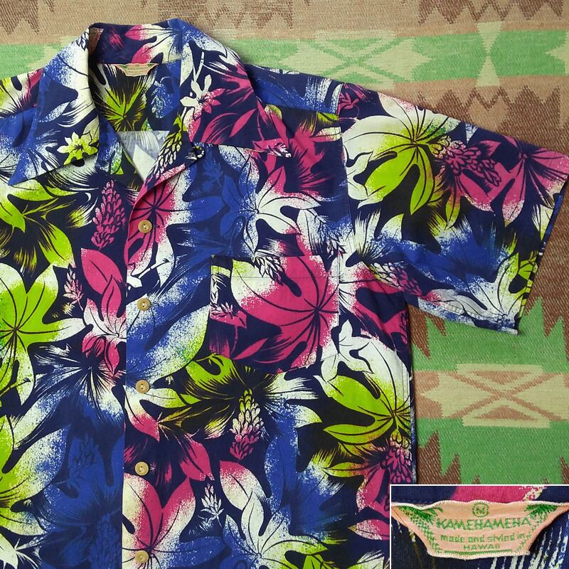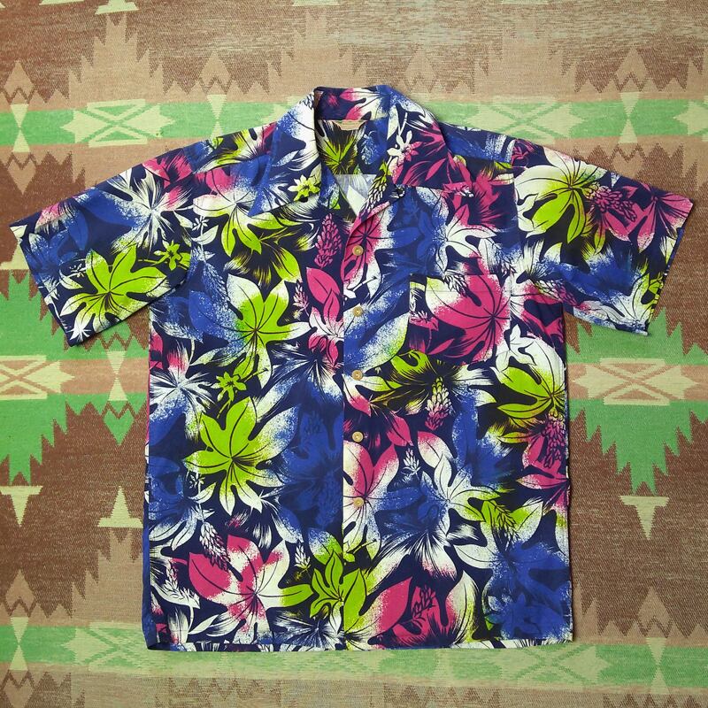 ネオンカラーのスプレーを吹いたような絵柄デザイン。80~90年代に多いテイストのカラーリングでありながら、王道ブランドの50sハワイ製ハワイアンシャツ。このシャツ、お好きな方にはすごく響くと思います。