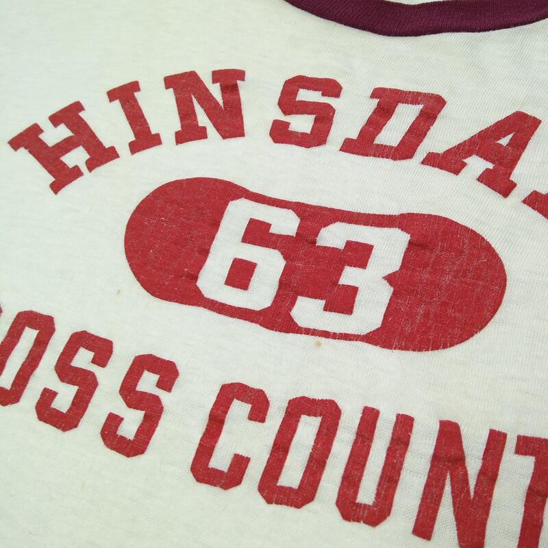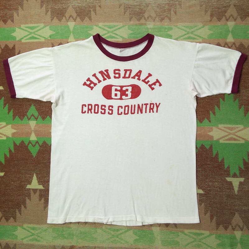 50年代の≪チャンピオン≫ランナーズタグTシャツ。白×マルーンのリンガー、表記なしですが100%コットンでしょう。プリントはフロッキーの毛羽立ちが剥げたものだと思います。
