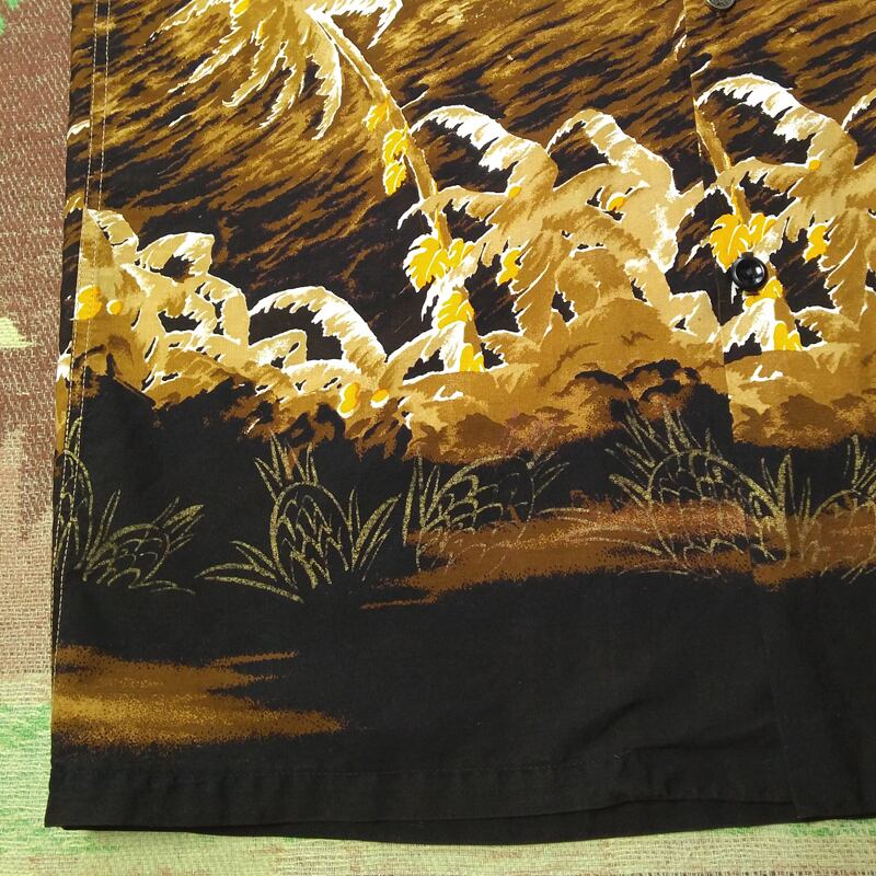 60年代の≪マリヒニ≫半袖コットンハワイアンシャツ。袋襟(プラ芯入り)、トップボタンはループ留め、古銭風ボタン。ポケット柄合わせ。